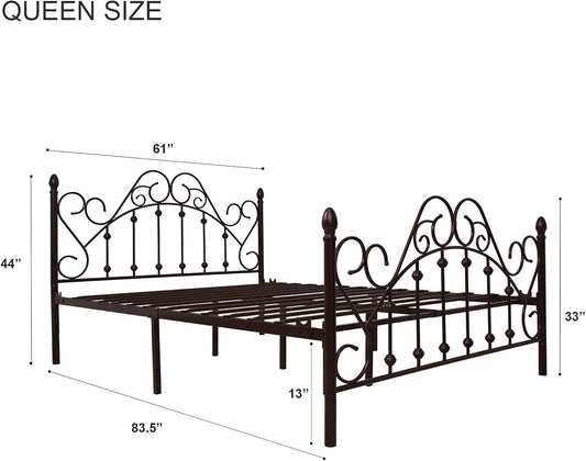 Queen Platform Metal Bed Frame Vintage Victorian Style, Antique Bronze Brown.